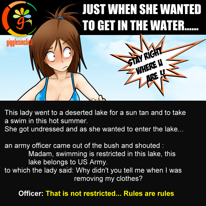 army, manners, rules, sun bath, lady, lake, jokes, lol, giggles, gigglesinclick.com, imagination, creativity
