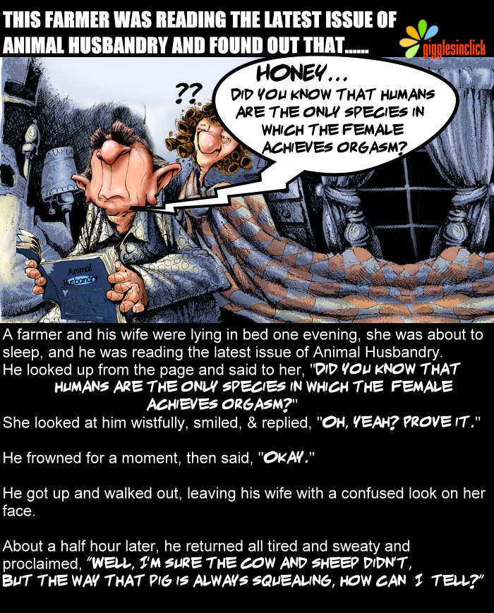 A farmer and his wife were lying in bed one evening; she was knitting, and he was reading the latest issue of Animal