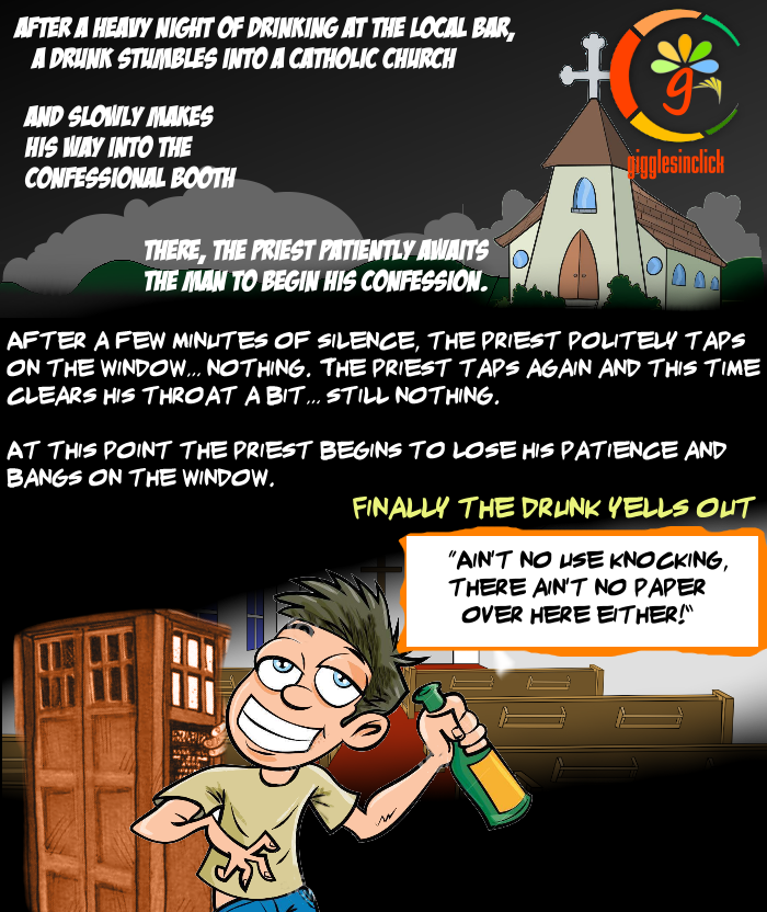 after a heavy night of drinking at the local bar, a drunk stumbles into a catholic church there the priest patiently awaits the man to begin his confession, but then this happened