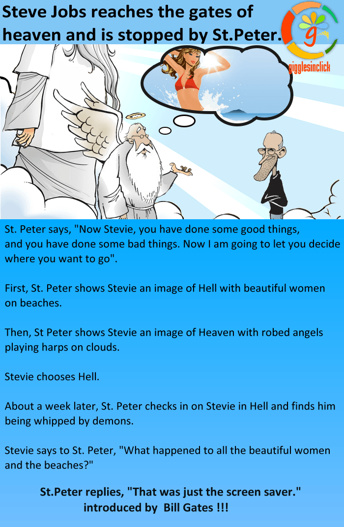 Saint peter stopped Steve Jobs at the pearly gates of heaven.