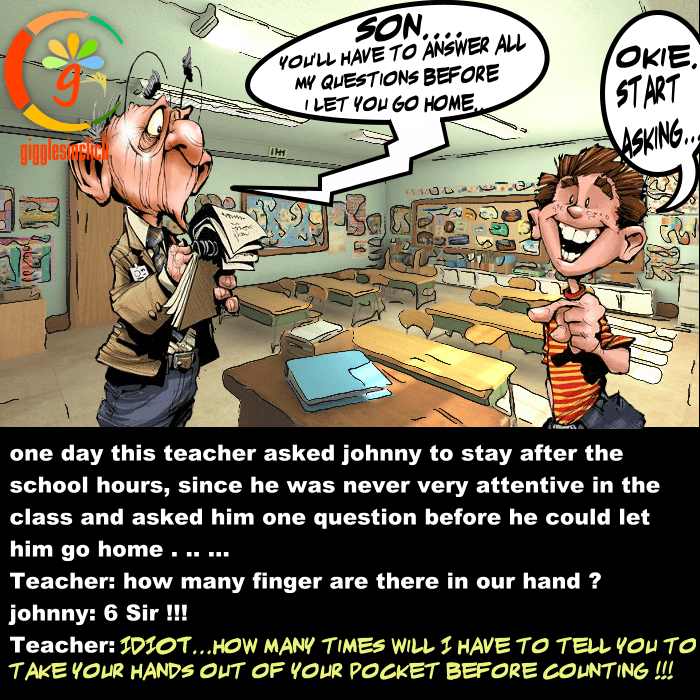 one day this teacher asked johnny to stay after the hours, since he was never very attentive in the class and asked him one question… how many finger are there in our hand ?to which johnny replied… 6 Sir !!!but then the Teacher replied in anger: IDIOT… how many times will I have to tell you to never count with your hands in your pocket !!!