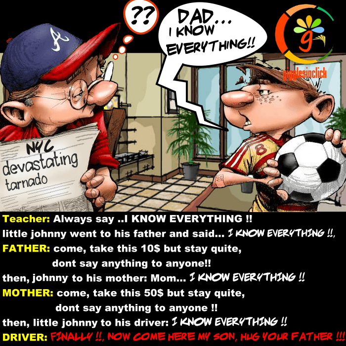 little jhonny went to his father and said… I KNOW EVERYTHING !!,FATHER: come, take this 10$ but stay quite, dont say anything to anyone!!then, jhonny to his mother: Mom… I KNOW EVERYTHING !! MOTHER: come, take this 50% but stay quite, dont say anything to anyone !! little jhonny to his driver… I KNOW EVERYTHING !! DRIVER: FINALLY !!!!, now come her my son, hug your father !!!