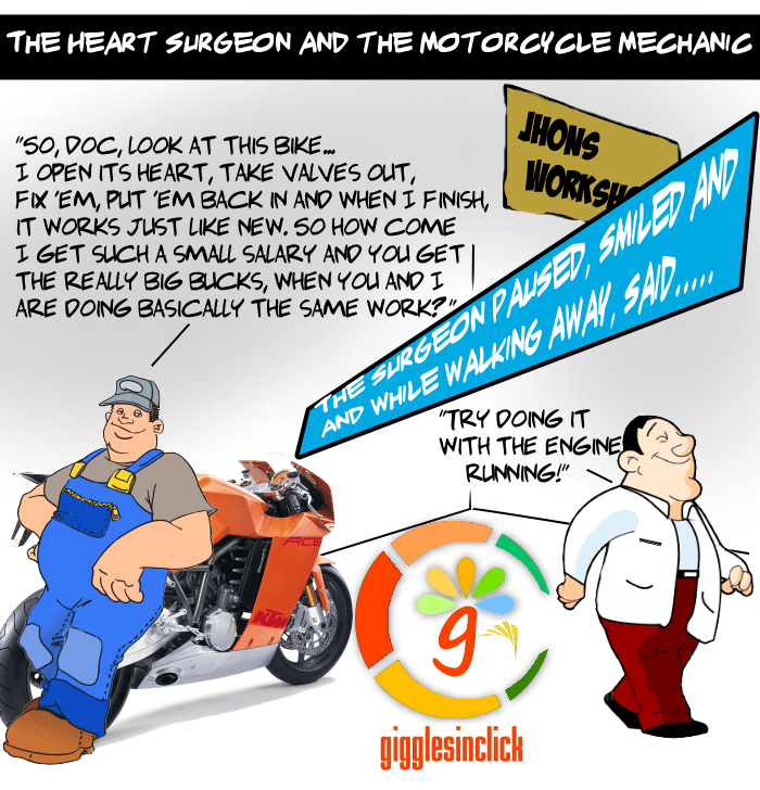 “So, Doc, look at this engine. I open its heart, take valves out, fix ’em, put ’em back in and when I finish, it works just like new. So how come I get such a small salary and you get the really big bucks, when you and I are doing basically the same work?”